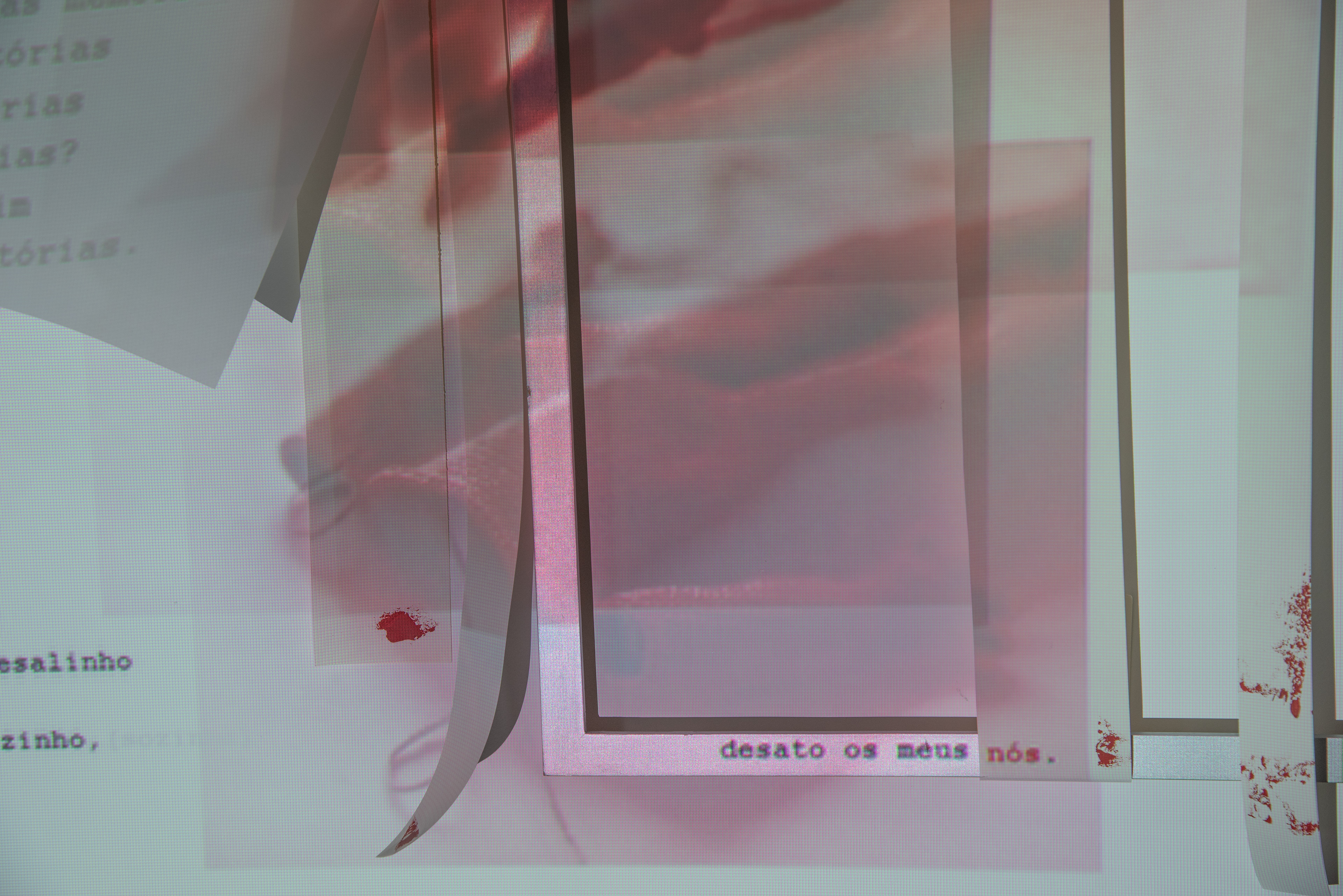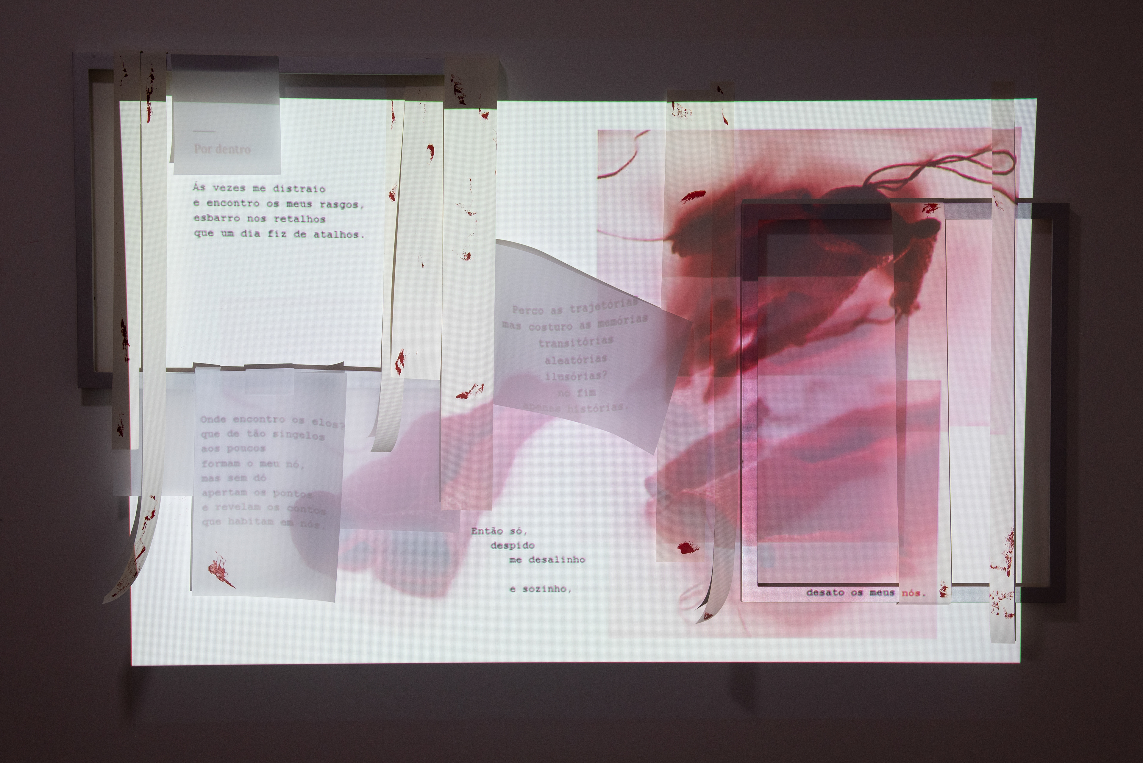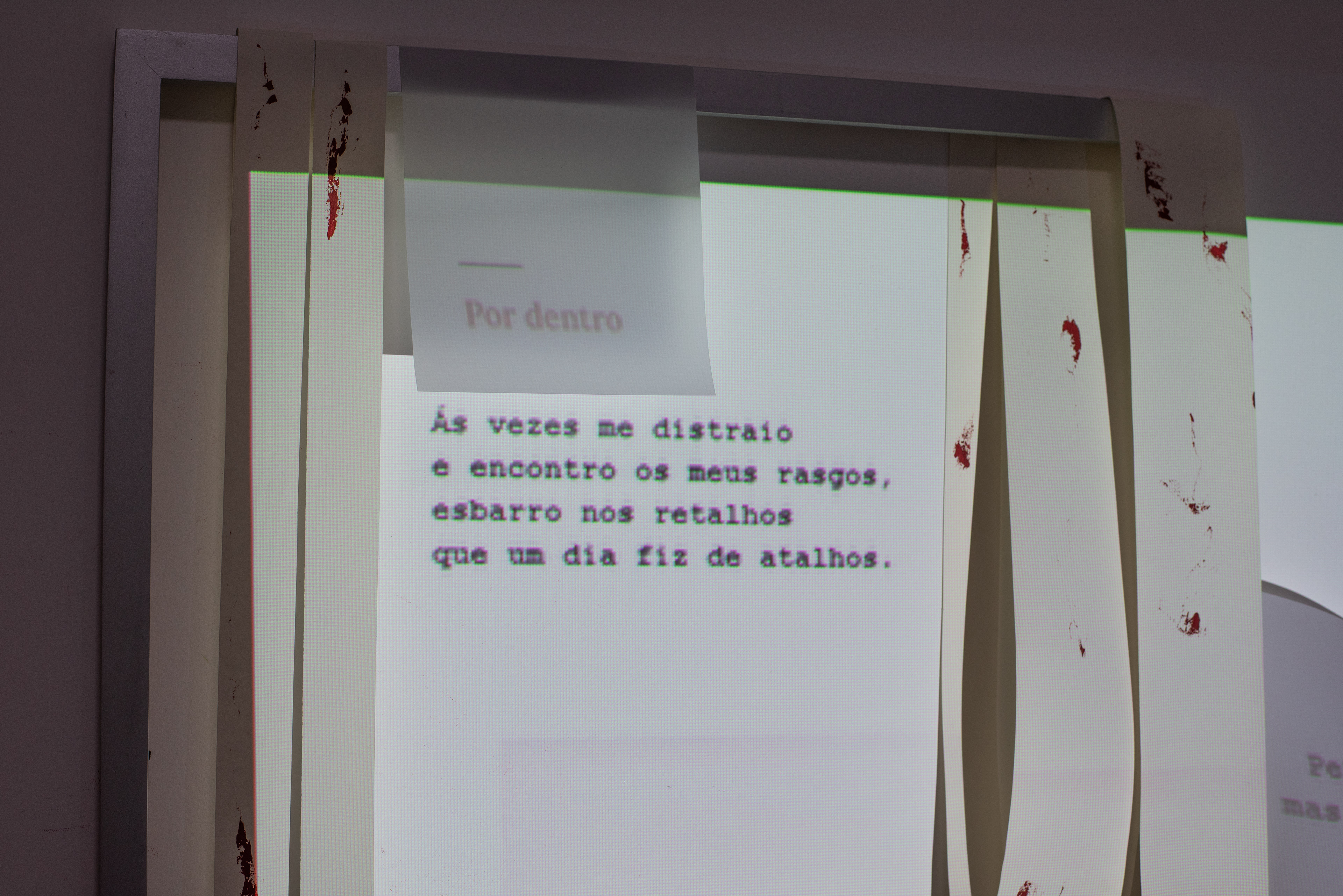 Por dentro, instalação (projeção de foto poema sobre molduras vazias, tiras de papel pólen machadas de tinta vermelha e papel vegetal), 120 cm x 75 cm, 2022.