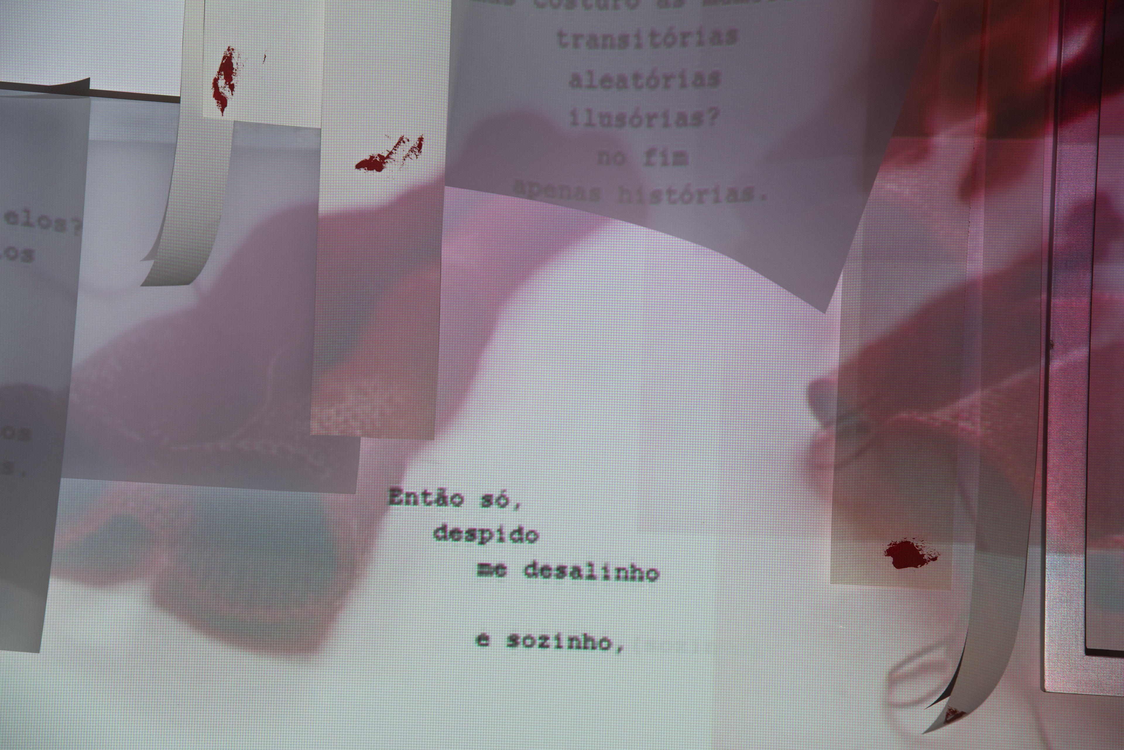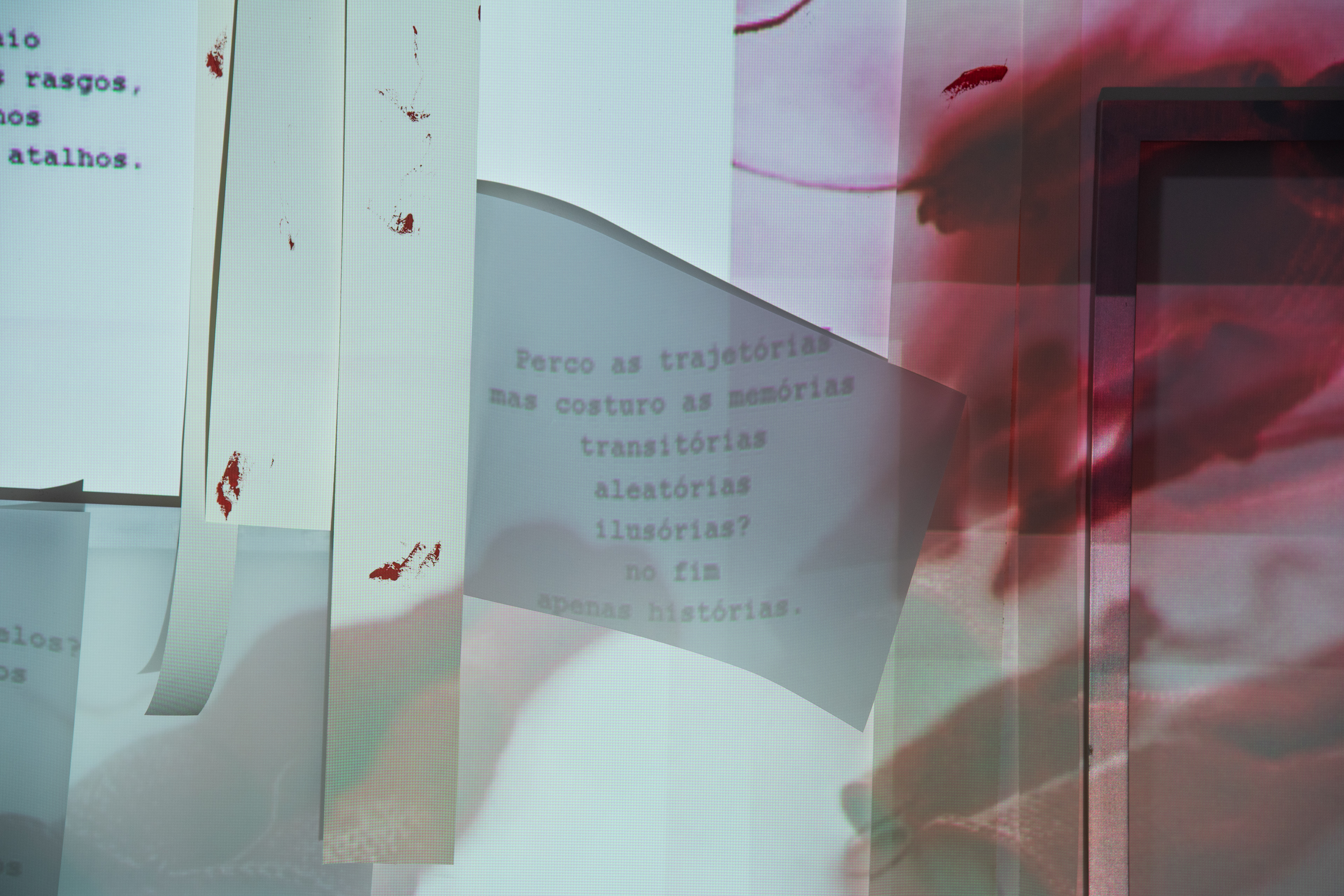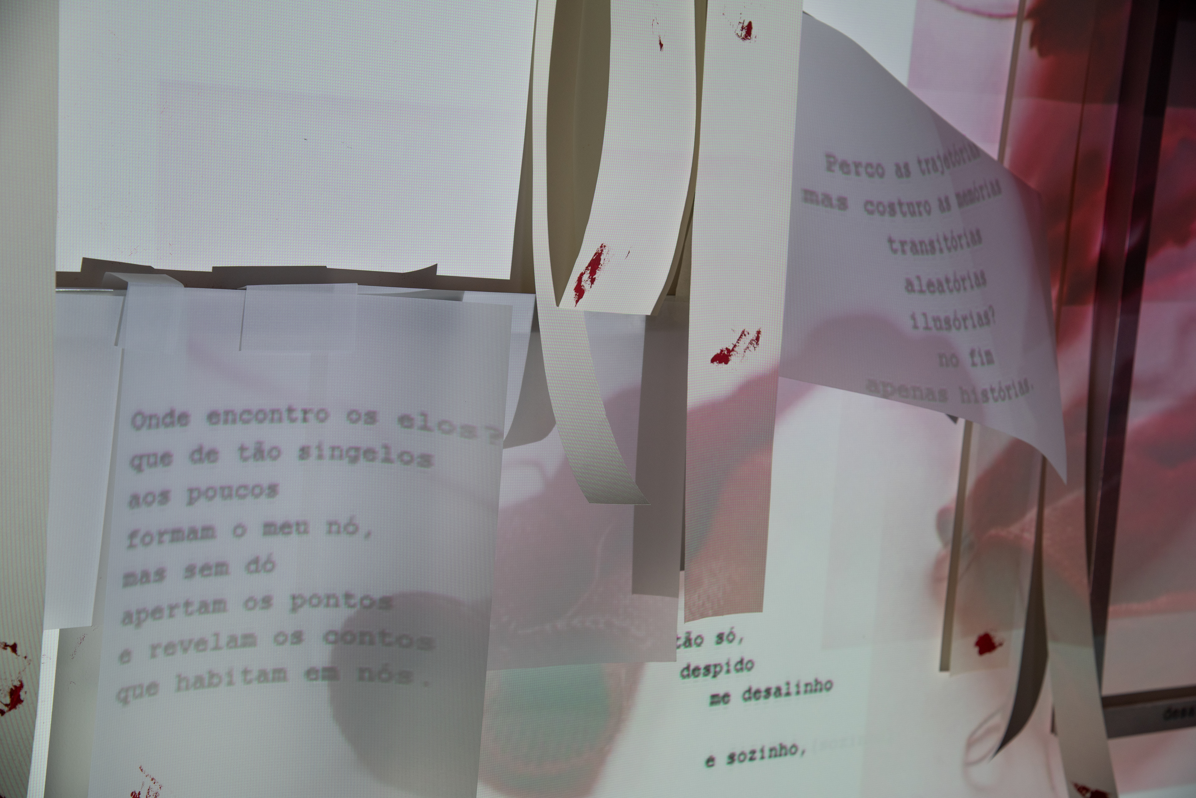 Por dentro, instalação (projeção de foto poema sobre molduras vazias, tiras de papel pólen machadas de tinta vermelha e papel vegetal), 120 cm x 75 cm, 2022.